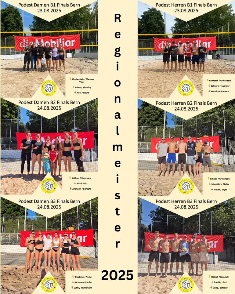 Das Finalturnier der Beachtour Bern-Solothurn fand im Sommer 2025 am 23.08.25 und 24.08.25 statt. Dabei wurden die besten Teams der Region Bern-Solothurn in allen Kategorien gesucht (siehe Bild für alle Sieger:innen). Das Finalturnier 2026 wird erneut gegen Ende August stattfinden.